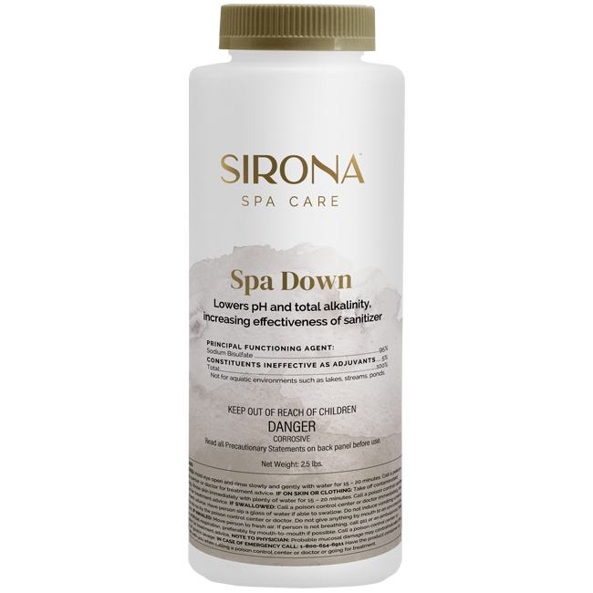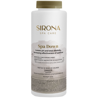 • Sirona Spa Down – A pH decreaser that improves sanitizer efficiency and prevents scale buildup.